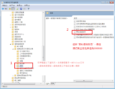 3. 右鍵編輯右方子視窗的限制連線數目,把選項設定為啟用,並且把允許的RD連線數目上限改為999999 (無限制上限)