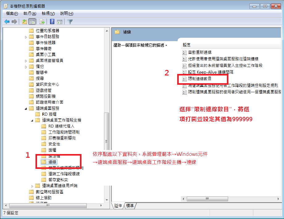 3. 右鍵編輯右方子視窗的限制連線數目,把選項設定為啟用,並且把允許的RD連線數目上限改為999999 (無限制上限)