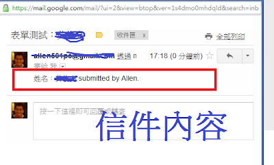 Step 2. 假設我的表單只有兩個欄位:姓名與Mail。按上方工具列,選擇工具→表單→編輯表格,先建立表單內容,然後按下存檔。