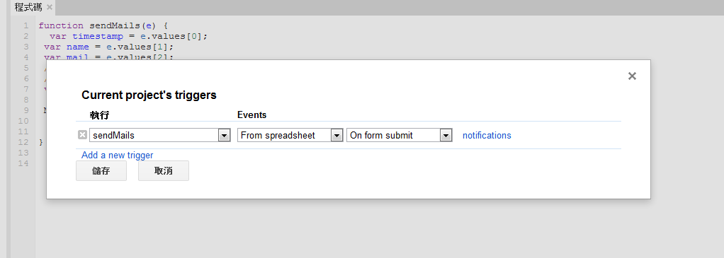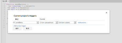 (2) 設定執行的函式為sendMails,Events 來源為From spreadsheet,動作為On form submit,然後儲存關閉。